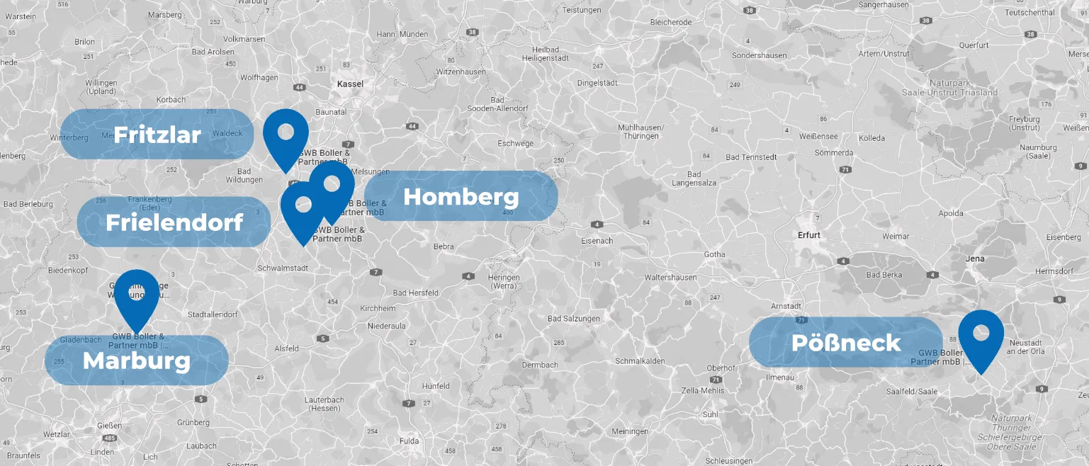 Als deutschlandweit und international tätige Unternehmensgruppe in Wirtschaftsprüfung, Steuerberatung und Rechtsberatung sind wir stolz auf unser starkes Team mit über 250 engagierten Mitarbeitenden an unseren hessischen Standorten. Dank unseres stetigen Wachstums freuen wir uns darauf, neue talentierte Kolleginnen und Kollegen in Marburg, Frielendorf, Fritzlar, Homberg / Efze und Pößneck bei Jena willkommen zu heißen.